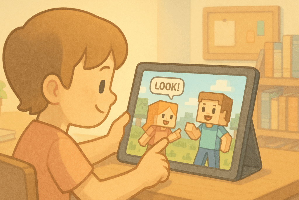 マインクラフトは、ものづくりや冒険、協力プレイを自由に楽しめるゲームです。スピードや勝敗を競うゲームではないため、英語を落ち着いて使う時間をしっかり確保できます。